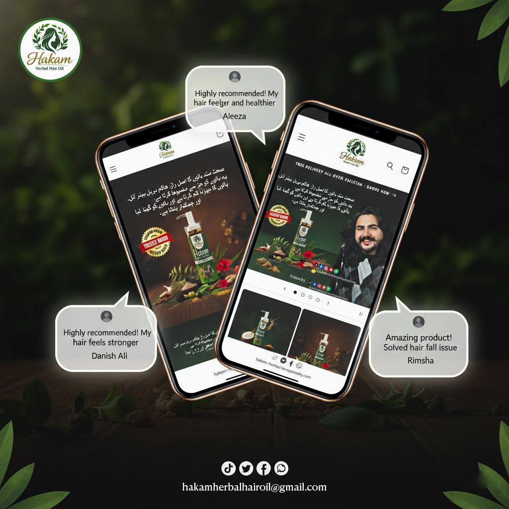 Hakam Herbal Hair Oil qudrati jari-bootiyon ka powerful blend hai jo baalon ki jarron tak ghus kar unhein mazboot banata hai. Yeh hair fall kam karta hai, scalp ko deeply nourish karta hai aur baalon ko healthy growth ke liye ready karta hai β baghair kisi harmful chemicals ke.